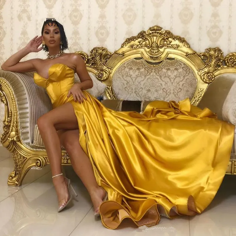 Yellow Gold Satin Mermaid Gold Satin Prom Dress With Sweetheart Neckline Split Hem Ruched Detailing And Sweep Train For Black Girls Formal Party And Evening Events From Misshowdress 123 63 Dhgate Com